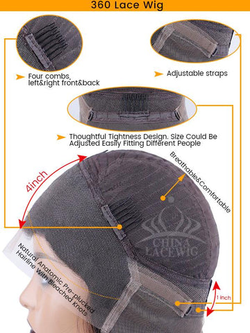 360 lace wigs are made by 360 lace frontal closures with some 100% human virgin hair bundles. 360 lace frontals go along your head around in a circle with an open on the top of the head and have 4 inches ahead, and 2 inches behind.